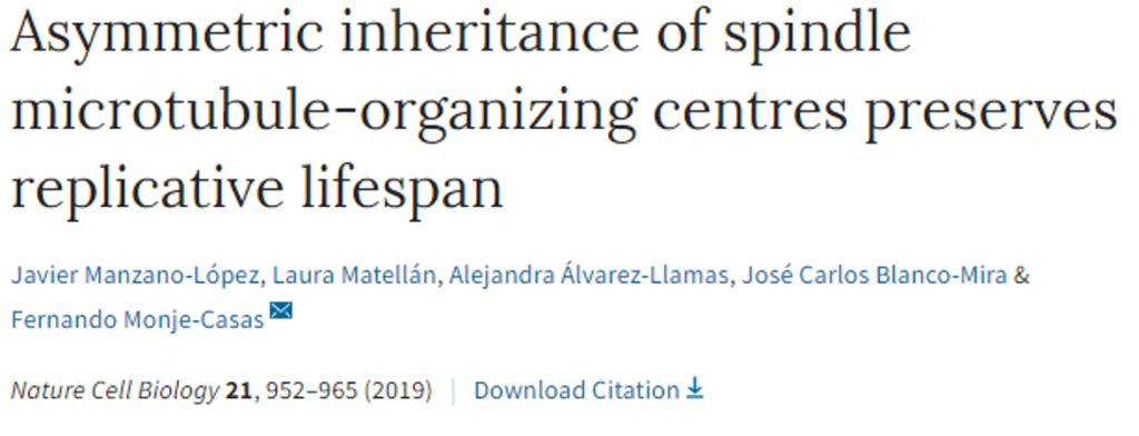 «Las células cuentan inicialmente con un solo MTOC, que, al igual que el genoma, se duplica durante la división celular. Tras su duplicación, el MTOC original y el nuevamente generado difieren en tamaño, composición y edad y al finalizar la mitosis se reparten entre las células producto de la división. Curiosamente se ha encontrado que estas estructuras pueden heredarse siguiendo un patrón predeterminado y no de forma azarosa durante la división asimétrica de algunas células».