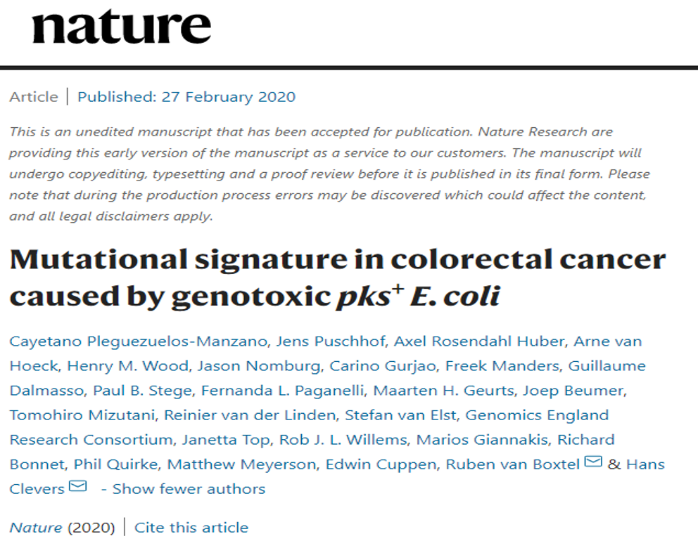 Un grupo de Científicos del Hubrecht Institute (KNAW) y del Princess Máxima Center en informan sobre los resultados del estudio que sugieren que una cepa común de la bacteria intestinal Escherichia coli podría estar contribuyendo directamente al cáncer de intestino al liberar una toxina, la colibactina, que causa mutaciones en las células que recubren el tracto gastrointestinal. Usando versiones en miniatura de tejido intestinal generados en el laboratorio, expuestos a una cepa específica de Escherichia coli, los investigadores descubrieron que esta bacteria induce un patrón de mutaciones en el ADN de células humanas. Este patrón también se encontró en el ADN de pacientes con cáncer de colon, lo que implica que estas mutaciones fueron causadas por estas bacterias «dañinas». Es la primera vez que los investigadores establecen una conexión directa entre los microorganismos que viven en nuestro cuerpo y alteraciones genéticas que promueven el desarrollo del cáncer. Este descubrimiento podría llevar a la prevención del cáncer de colon a través de la erradicación de estas bacterias dañinas. Los resultados de esta investigación han sido publicados el 27 de febrero en la revista Nature: titulado: “Mutational signature in colorectal cancer causes by genotoxic pks+ E. coli.”
